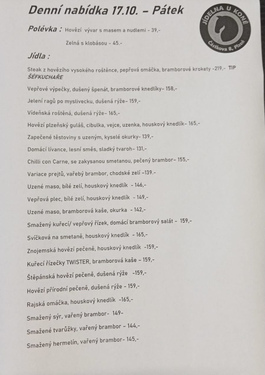 Máte polední pauzu? Pak se u nás v kuchyni „Jídelna u Koně“ zastavte ochutnat skvělé a jednoduché domácí pokrmy. Těšíme se na Vaši návštevu. Kuchyně nabízí přesně to, co co jste kdy hledali. Využijte výhod naší kuchyně a nechte se okouzlit nečekaně širokým výběrem pokrmů i nápojů. To vše u nás za výhodné ceny. Bez ohledu na venkovní teploty se v našich klimatizovaných prostorách budete cítit stále příjemně.