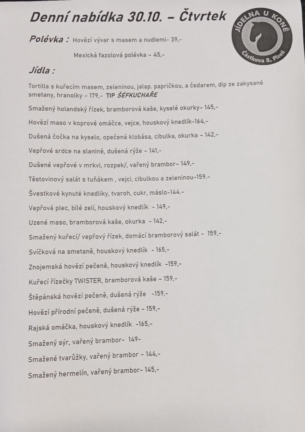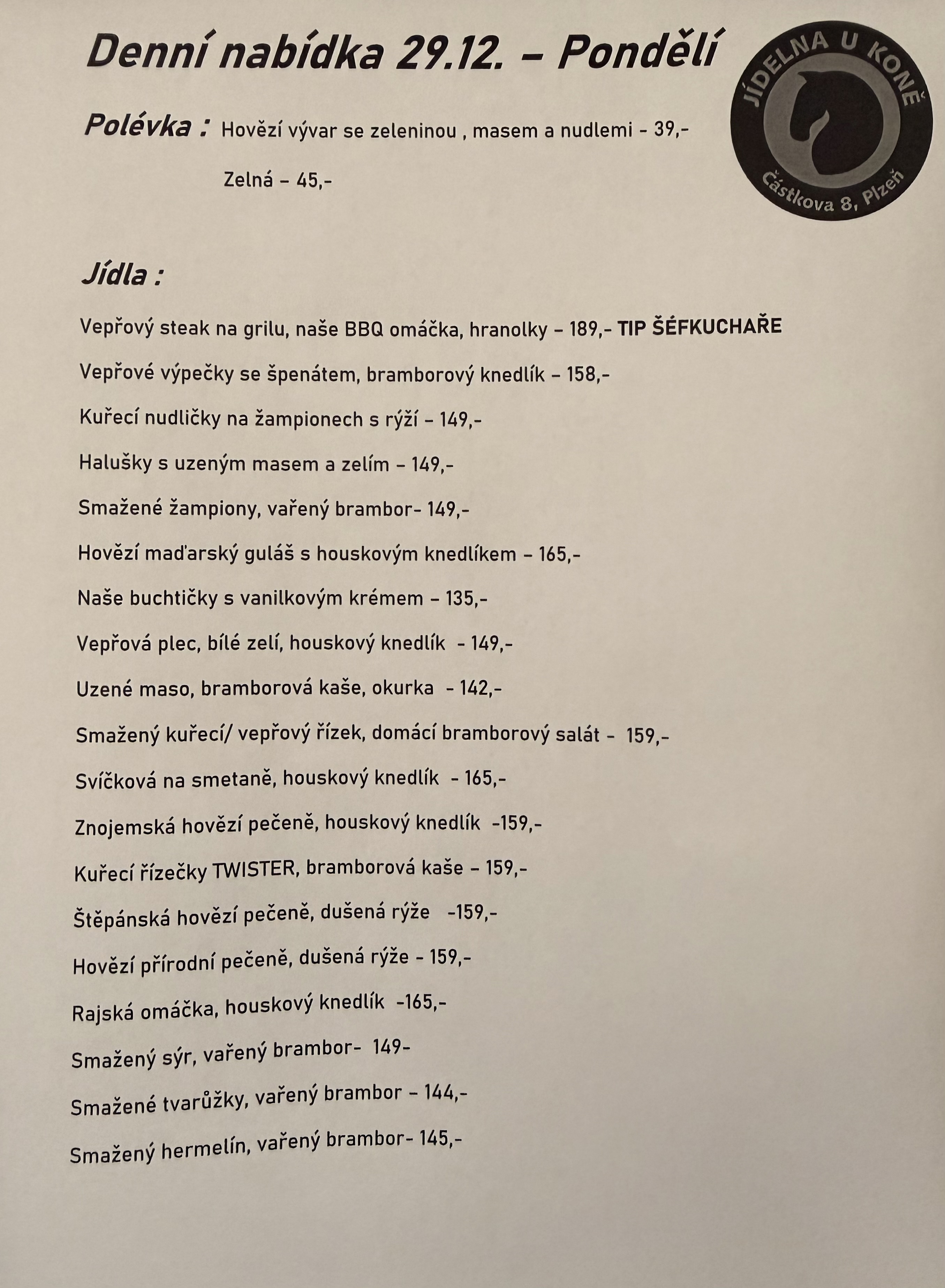Máte polední pauzu? Pak se u nás v kuchyni „Jídelna u Koně“ zastavte ochutnat skvělé a jednoduché domácí pokrmy. Těšíme se na Vaši návštevu. Kuchyně nabízí přesně to, co co jste kdy hledali. Využijte výhod naší kuchyně a nechte se okouzlit nečekaně širokým výběrem pokrmů i nápojů. To vše u nás za výhodné ceny. Bez ohledu na venkovní teploty se v našich klimatizovaných prostorách budete cítit stále příjemně.
