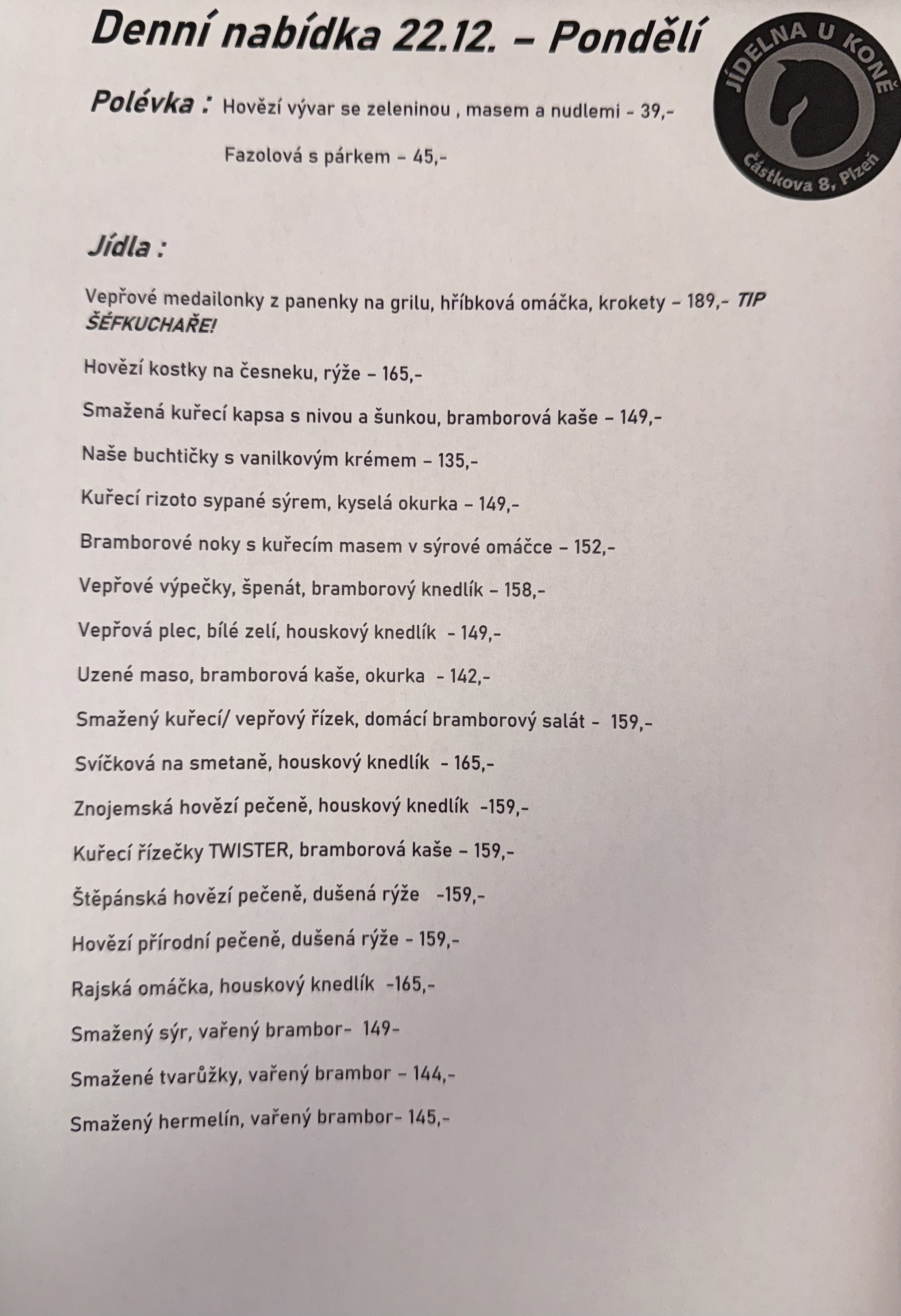 Máte polední pauzu? Pak se u nás v kuchyni „Jídelna u Koně“ zastavte ochutnat skvělé a jednoduché domácí pokrmy. Těšíme se na Vaši návštevu. Kuchyně nabízí přesně to, co co jste kdy hledali. Využijte výhod naší kuchyně a nechte se okouzlit nečekaně širokým výběrem pokrmů i nápojů. To vše u nás za výhodné ceny. Bez ohledu na venkovní teploty se v našich klimatizovaných prostorách budete cítit stále příjemně.